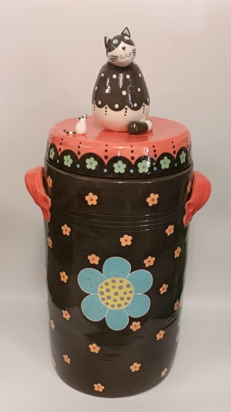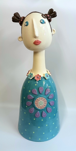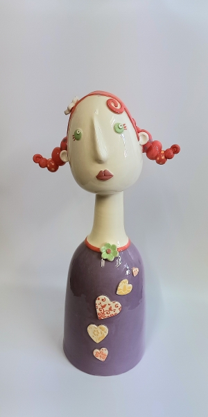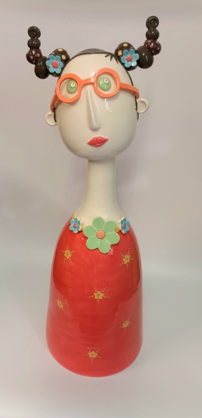 Corps en tissu remplit de graines, tête, mains et pieds en céramique peint à l'acrylique.